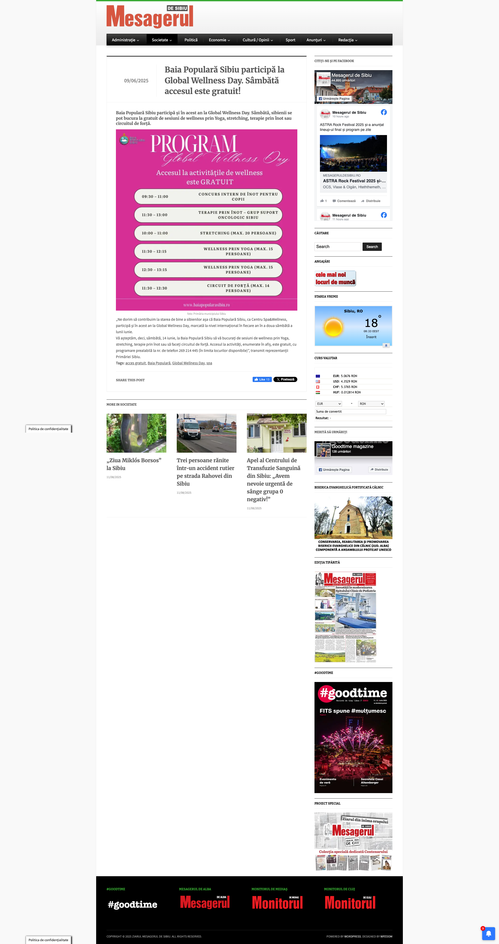 Baia Populară Sibiu participă la Global Wellness Day. Sâmbătă accesul este gratuit! / Mesagerul