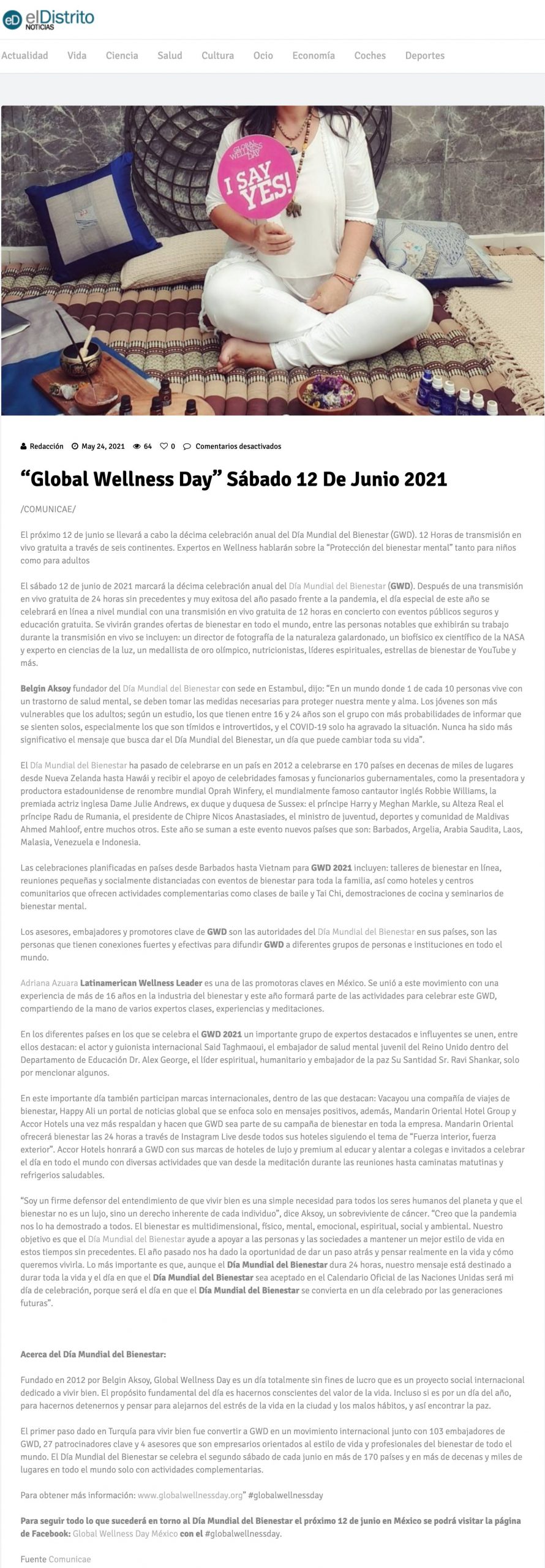 “Global Wellness Day” Sábado 12 de Junio 2021 / El Distrito Noticias