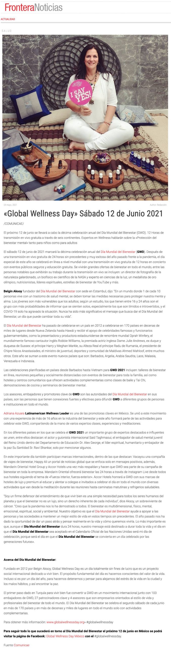 “Global Wellness Day” Sábado 12 de Junio 2021 / Forontera Noticias